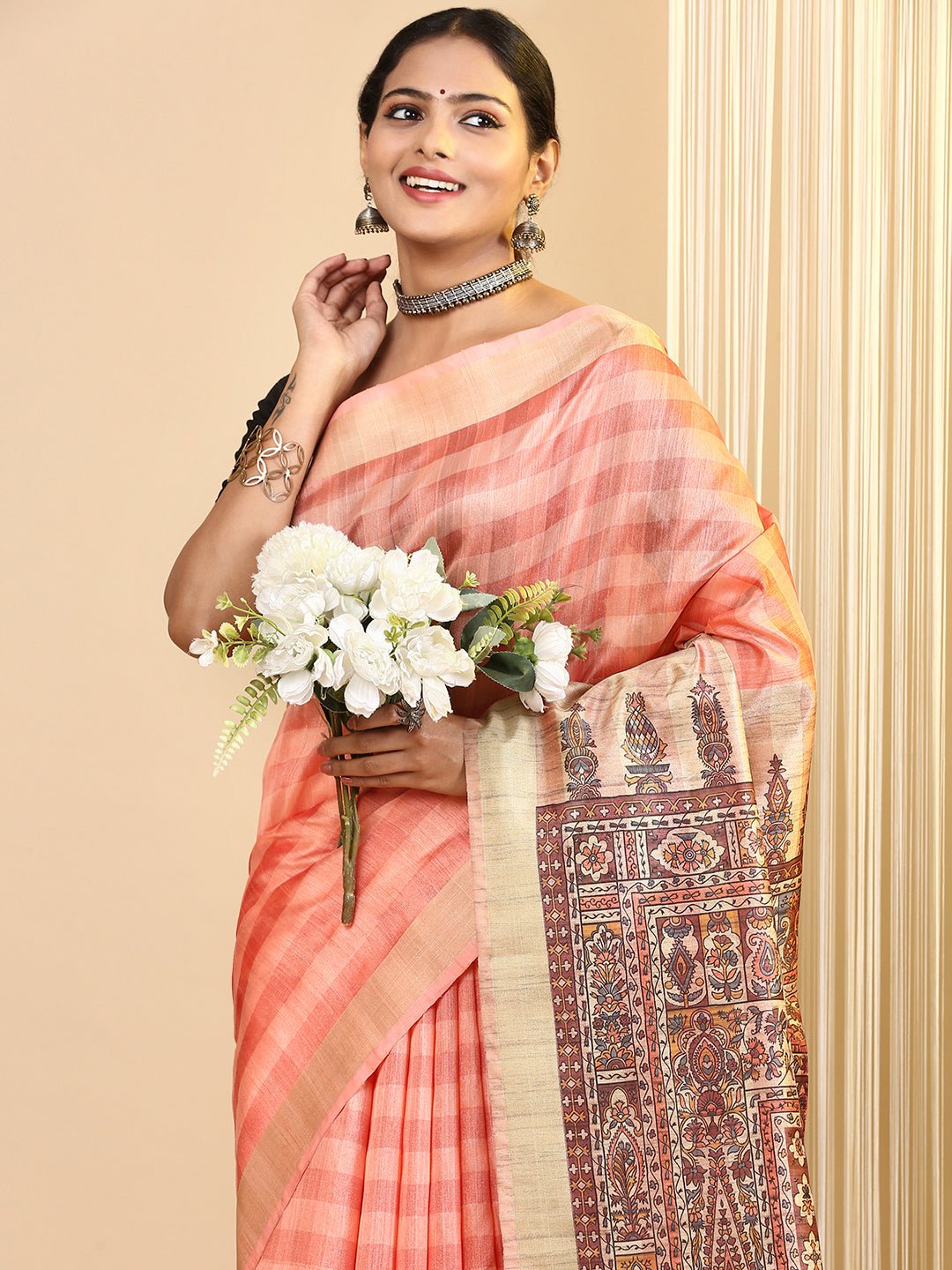 Semi Tussar Weaving sarees exude a timeless elegance that seamlessly blends tradition with modern sophistication. Crafted from a blend of silk and cotton, these sarees bear the hallmark sheen and texture of Tussar silk while offering the comfort and durability of cotton. The fabric has a luxurious feel against the skin, making it perfect for both casual wear and special occasions. This distinctive texture is often complemented by intricate weaving techniques, such as jacquard or handloom weaving, which add depth and dimension to the fabric.